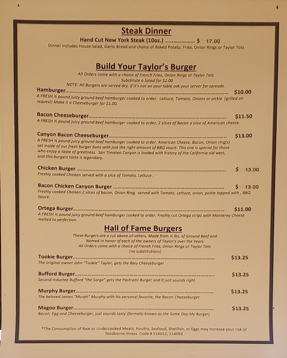 Welcome to Taylors Bar & Grill, a gem located in Redlands, CA, where the menu beautifully blends comfort and flavor. Here, you’ll find a tantalizing array of appetizers that kick off your meal on a high note, including crispy Chicken Strips and zesty Jalapeno Poppers. For those craving heartier options, the three-egg omelets are a standout. Choices like the savory The Pig's Omelet and the flavorful Chili Cheese Omelet are crafted to satisfy even the toughest morning cravings.